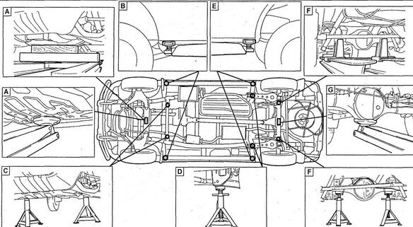 Соблюдайте следующие правила: а) Перед выполнением работ с электрооборудованием отсоедините кабель от отрицательной клеммы аккумуляторной батареи. б) Если необходимо отсоединить аккумуляторную батарею для контрольной проверки или проведения ремонтных работ, обязательно в первую очередь отсоединяйте кабель от отрицательной клеммы, которая соединена с кузовом автомобиля. в) При проведении сварочных работ, следует отсоединить аккумуляторную батарею и разъемы электронных блоков управления. Проверяйте надежность и правильность крепления соединительных муфт и штуцеров шлангов и разъемов проводов. Детали, не подлежащие повторному применению. а) Фирма "Mitsubishi" рекомендует заменять сальники, уп-лотнительные прокладки, кольцевые прокладки, стопорные шайбы, разводные шплинты, пластичные гайки (с капроновой юбкой) на новые. б) Детали, не подлежащие повторному использованию, могут быть отмечены на рисунках или в тексте. Перед проведением работ в покрасочной камере, следует отсоединить и снять с автомобиля аккумуляторную батарею и электронные блоки управления. При выполнении операций по сборке в зависимости от мест расположения деталей: а) При необходимости нанесите герметик на уплотнитель-ные прокладки, чтобы предотвратить появление утечек. б) Наносите масло на движущиеся части деталей. в) Определенное масло или смазку необходимо нанести в предварительно указанных местах (на сальники и т.п.) перед сборкой. Не допускайте попадания масла или бензина на резиновые детали автомобиля. Тщательно соблюдайте все технические условия в отношении величин момента затяжки резьбовых соединений. Обязательно пользуйтесь динамометрическим ключом. В зависимости от характера производимого ремонта может потребоваться применение специальных материалов и специального инструмента для технического обслуживания и ремонта. При замене перегоревших предохранителей нужно проследить, чтобы новый плавкий предохранитель был рассчитан на соответствующую силу тока. ЗАПРЕЩАЕТСЯ превышать это номинальное значение тока или вставлять предохранитель более низкого номинала. При поддомкрачивании автомобиля и установке его на опоры должны соблюдаться соответствующие меры предосторожности. Нужно проследить за тем, чтобы поднятие автомобиля и установка под него опор производились в предназначенных для этого местах. а) Если автомобиль должен быть поддомкрачен только спереди или сзади, нужно проследить, чтобы колеса противоположной оси были надежно заблокированы с целью обеспечения безопасности. б) Сразу же после поддомкрачивания автомобиля нужно обязательно установить его на подставки. Крайне опасно производить какие-либо работы на автомобиле, вывешенном только на одном домкрате. в) Во избежание образования задиров на кузове подложите кусок ветоши под упор домкрата (для предотвращения образования коррозии, вызванной повреждением лакокрасочного покрытия). Точки установки упоров гаражного домкрата и лап подъемника Расположение упоров. A, G - точка установки упора для подкатного гидравлического домкрата; С, D, F - точка установки упора для раздвижных стоек; В, Е - точки установки упоров подставок лап двухстоечного подъемника или домкратов винтового типа; A, F - точки установки упоров подставок лап одностоечного подъемника. Внимание: запрещается став