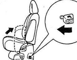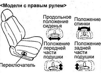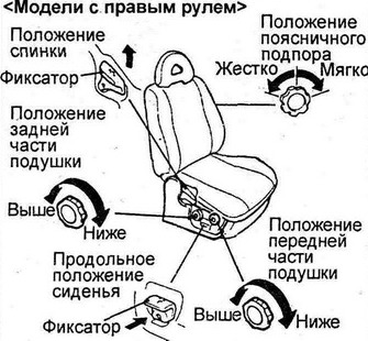 Сиденья Внимание: - Обязательно отрегулируйте сиденье перед поездкой. Отрегулируйте высоту подголовника так, чтобы его центр находился на уровне глаз. - После регулировки убедитесь в том, что сиденье надежно зафиксировано. - Во время движения не кладите подушку или что-либо подобное между спиной и спинкой сиденья. Это уменьшит эффективность действия подголовников при аварии. - Для уменьшения опасности травмирования в случае столкновения или резкого торможения спинки сидений водителя и пассажира во время движения автомобиля должны находиться в вертикальном положении. Когда спинка сиденья наклонена назад, защитное действие ремней безопасности значительно снижается. Возникает опасность, что человек при столкновении и резкой остановке автомобиля выскользнет из-под ремней, что может привести к серьезной травме. Регулировка передних сидений Регулировка сиденья осуществляется с помощью соответствующих рукояток, как показано на рисунках. На сиденье без электропривода для регулировки продольного положения или наклона спинки потяните рукоятку, переместите сиденье в нужное положение и отпустите рукоятку, чтобы зафиксировать сиденье. Примечание: расположение и действие некоторых рукояток для моделей с левым рулем зеркально отличается от приведенного на рисунках. (Сидениья без электропривода) Сиденья с электроприводом By Yustas
