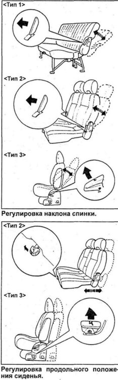 Регулировка и складывание сидений второго ряда 1. Регулировка сиденья осуществляется с помощью соответствующих рукояток, как показано на рисунках. Для регулировки продольного положения сиденья или наклона спинки потяните рукоятку, затем переместите сиденье в нужное положение и отпустите рукоятку, чтобы зафиксировать сиденье. 2. (Тип 1) Складывание сидений, а) Потяните рычаг фиксатора спинки сиденья с нужной стороны и сложите спинку сиденья вперед. Нажимайте на спинку сиденья до щелчка, после которого сиденье будет зафиксировано. б) Потянув за ремень фиксатора подушки сиденья, приподнимите подушку сиденья, как показано на рисунке. В другой теме представлены второй тип сидений. By Yustas