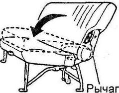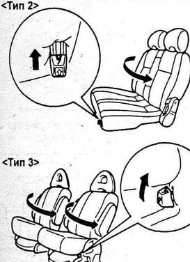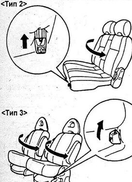 Складывание сидений. а) Установите сиденье в стандартное положение (передняя часть сиденья в сторону моторного отсека). б) Нажмите на рычаг, как показано на рисунке и сложите подушку сиденья. в) Потяните рычаг продольного положения сиденья и сдвиньте сиденье вперед. ж) Раскладывание сидений производится в обратном порядке. 4. (Тип 2 и 3) Поворот сиденья. Внимание: - После вращения сиденья убедитесь, что оно надежно зафиксировано. - При вращении сиденья будьте осторожны, чтобы не прищемить руку или ногу. а) Потяните рычаги продольного положения сиденья и регулировки положения спинки и верните сиденье в первоначальное положение, б) Потяните за рычаг вращения сидений и поверните сиденье влево. В другой теме будет показана регулировка сидений третьего ряда. By Yustas.