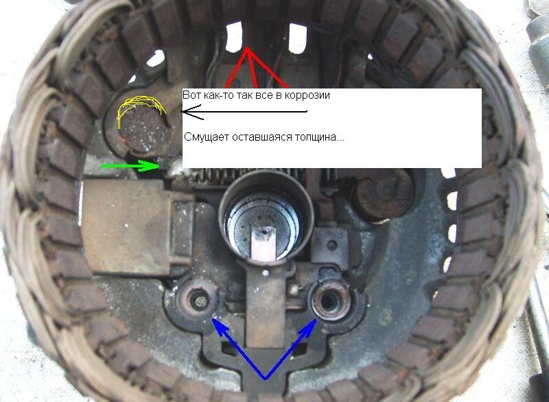 Не нашел в теме ни выше, ни ниже Итак! Парни, столкнулся с такой же проблемкой... Не могу решить ее уже месяц!!! Генератор уже снимаю и ставлю с закрытыми глазами за 2.5 минуты! (засекали) ПОМОГИТЕ СОВЕТОМ! Предистория: Летом как-то не завелась... Поменял АКБ, чуть поездил - тоже самое. Пока думал - решил сделать очередное ТО. На яме замечаю: отломалась "+" клемма на проводах, подходящих к генератору. Нашел какую-то клемму, обжал, поставил - заработало... но не долго. Как-то в один прекрасный момент она перестала заводиться (типа сдохли АКБ). Прикурил. Загорелись лампы в пол-накала АКБ и воды в фильтре. Доехал до дома, предусмотрительно оставил авто на горке и заглушил. Так и есть... заводиться повторно отказалась. Снимаю 2 АКБ, несу домой, заряжаю, меряю. Один - жив, второй под нагрузочной вилкой приказал долго жить. На работе достаю почти новый, но меньшего размера и емкостью. Ставлю, естественно, путаю полярность, но как ни странно, ничего не горит. Завожу, горят всем знакомые индикаторы. Привожу на работу (дилерство Тойоты). Снимаю первый раз генератор. Щеткам писец. Тойотовские не подходят. Еду, покупаю неоригинал. Ставлю - не работает, нет зарядки. Снимаю, разбираем повторно - все собрано нормально, ставим. Лезем с контролькой - не приходит "+" на обмотку. Лезу выше по проводам... Какой-то разъем территориально около реле свечей накала. В разъеме 3 провода, 2 из которых отгнили и окислились. Скручиваю. Заводим. +12,0 Стоит что-нибудь включить - падает до 11,5; 11,0. Снимаем генератор. Подаем питание на обмотку. Крутим генератор вручную - явно заметно неслабое усилие. Ставим. Зарядки нет. Кстати, тут выкладывали фото... Сейчас прикреплю... У меня болт, выходящий на плюсовую клемму (у зеленой стрелки на фото) прокородировал. Точнее, вокруг него. Может, тоже причина? Заколебало все, едем в контору, готовы отвалить бабло, т.к. уже все выматало. Диагностика бесплатно, приговаривают РР. Меняют. Заодно и сальник, чтоб потом когда-нибудь не лезть второй раз. Ставлю генератор, завожу. все ОК, лампочки потухли, но на обратном пути - опять дискотека на панеле приборов. Те же 2 лампы. Пока авто стоял на хх, услышал металлический скрежет. заглядываю вниз (благо авто лифтовано) и вижу, как из генератора искрит все! замерил напряжение +12,0 Думаю: разнесу всю контору! Приезжаю - спец заболел, но мы посмотрим, если снимите его. Снимаю за 2 минуты, проверяют, говорят все ок!!! Рабочий!!! На вопрос, что искрило - отвечают: открутился внутри болтик и по якорю..., но мы его не трогали! Я не возмущаюсь, т.к. возможно, они действительно его не трогали, а трогали мы сами... Ставлю генератор, завожу, меряю: вместо 12.0 стало 12,5. Показываю. На что получаю мудрую мыслю произвести замер не на АКБ, а на генераторе. Реально! На генераторе 13,5 13,8 Вопросы: Кто-нибудь сталкивался с геморром в проводке? Что делать? искать плохое соединение или бросить в параллель еще провод? Как убедиться, что генератор ПОЛНОСТЬЮ исправен (РР)? Хочу на зиму поменять АКБ: что лучше - найти причину и поменять АКБ или наоборот, с новыми АКБ искать? Личные соображения: возможно, хреновая клемма, которую я обжал вместо отгнившей старой, приходящей на + генератора. Возможно, внутреннее соединение. Интересно, оно сильно влияет? (фото)