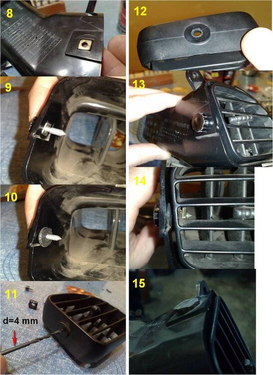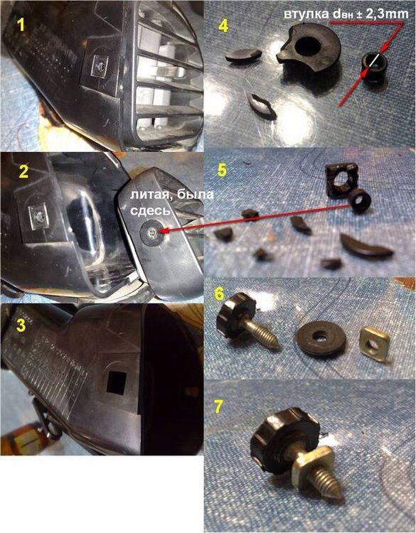 Может пригодится кому это - Не так давно в очередной раз решил направить поток воздуха из вентрешётки, которая справа от руля, в нужном мне направлении (причём без особых усилий, как и всегда). И обнаружил, что она проваливается своим левым боком внутрь канала. Сломалась. Снял панельку (кстати панельку, шоб не сломать, удобно снимать - предварительно переведя рычаг АКПП в крайнее нижнее положение). Открутил от панельки решётку (она там держить просто - на двух по диагонали саморезах) и забрал домой кулибить На 1 фото видно, что в квадратном гнезде короба вставляется квадратная вставочка переходящая в круглую шайбу. Во вставке, на первый взгляд, кажется есть только отверстие. Когда же запустил туда сверло (думал рассверлить диаметр больше) оно на себе вывернуло муфточку (подписана на фото). Стал ясен принцип крепления решётки. Вот японцы , надож на такой тонкостенной и слабой втулочке держаться наши решётки в панелях машин. Когда стал работать с этой квадратной вставкой, она была обсолютна целая. Но при удержании её в руках выступающие круглые поля литой шайбы просто стали потихоньку откалываться, даже открашиваться при малейшем на них нажатии. Настолько постарел пластик! Остатки от той детальки тоже запючатлены. Пришлось искать замену. Кстати пластик этот блин какой-то странный Что его расстворяет? Хотел дихлорэтаном склеить нифига не берёт, испаряется и всё . Рассыпав банку с болтами и гайками на столе, удачно подобралась квадратная гайка от кантактов обычной эл.розетки))). Также нашёлся, какой-то зажим или ручка (радиодеталь что ли). И нашлась резиновая шайбочка-прокладка удачно нужной толщины и диаметра (но лучше материал типа пропилена). Дальше по фото всё видно. Изнутри ещё гровер под гайку одел. При сборке пришлось подсточить на угол шляпку зажимчика, а то чуть упирался в стенку панели. Щас всё гуд. P.S. Снял и остальные решётки пока целые. Их крепёж придумал как усилить, дабы потом не сломались. (Если сам не переломаю пока делаю )