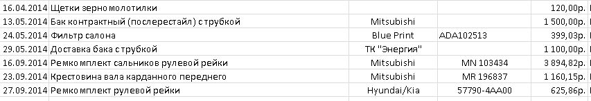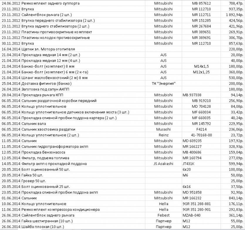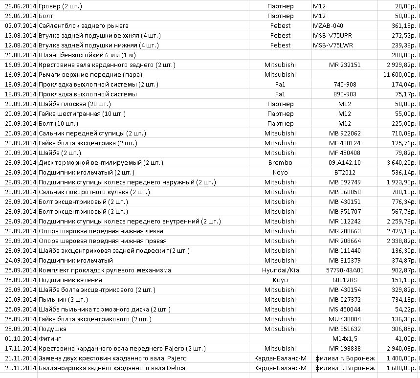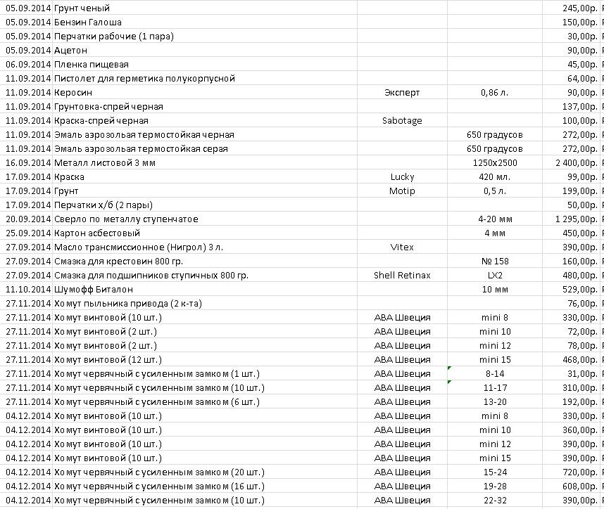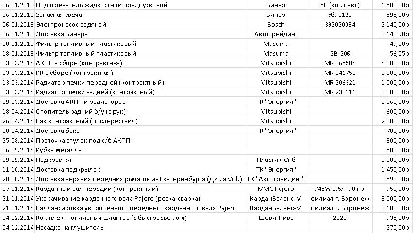 S.Т.А.L.К.Е.R. Опубликовано 15 января, 2015 Автор Жалоба Опубликовано 15 января, 2015 (изменено) Далее информация не для слабонервных По Вашим просьбам, как и обещал, я примерно посчитал деньги, истраченные на "развратные" действия, происходящие в этой теме, по состоянию на 1.01.2015. Итак, начну с так называемых "Безвозвратных вложений", сюда отнесу приобретение каких то изделий, оплату каких то услуг: Всего 46500 р. Далее, вложения на "Капитальный ремонт", сюда в основном относим приобретение запчастей: Всего 53700 р. Далее, "Расходные материалы", название говорит само за себя, отмечу лишь что далеко не все из приобретенного израсходовано полностью и не только на Делику: Всего 22700 р. Далее, "Инструмент", много из приобретенного по данной статье прослужит еще много лет, а что то уже приказало долго жить. То есть эти расходы больше относятся к моему "техническому оснащению", нежели к Делике, но так или иначе имели место быть: Всего 46400 р. Не обошлось и без "Пустых трат", то что куплено зря, не подошло, не пригодилось, не использовано: Всего 8800 р. Итого примерно 178 тыс. рублей. Сам в шоке P.S. Забыл аренду блок-комнаты 15 месяцев по 2000 р. = 30 тыс. р. Изменено 16 января, 2015 пользователем S.Т.А.L.К.Е.R. Цитата