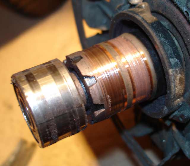 Roxer Опубликовано 11 февраля, 2006 Автор Жалоба Опубликовано 11 февраля, 2006 Вот коллектор, на нем хорошо видно, что наружная щетка хорошо работала, её кольцо гадкое, и блестящее. А вот внутреннее кольцо, тусклое, щетка к нему не прижималась, и судя по всему напряжение на обмотку ротора, через такой контакт подавалось короткими импульсами, при врашении, может и через искру, может через частички износа щеток, но генератор судя по всему всеже немного работал, выдавая нормальное напряжение импульсами, в те короткие моменты, когда щетка всёже касалась коллектора. Может из-за этого (как от помехи) загоралась лампочка воды в топливном фильтре? Цитата
