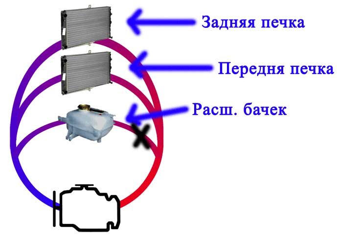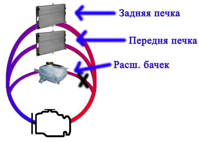 M397EB Опубликовано 2 февраля, 2012 Жалоба Опубликовано 2 февраля, 2012 (изменено) Всем здрасте. Случайно открыв расширительный бачок и засунув туда глаз обнаружил, что внутри охлаждайка бьет ключем, именно сама ОЖ а не пузыри. проследив шланги от бачка обнаружил, что бачок подключен помимо радиатора еще и к подаче и обратке печек. Т.е. он подключен параллельно печкам. Попытался изобразить: . Получается что гонять помпе жидкость через бачок легче всего (по пути наименьшего сопротивления) и основная циркуляция идет именно через него а не через печки где более длинный контур и радиатор в качестве сопротивления. Помозговав решил пережать шланг подачи в бачок ( На рисунке обозначил крестом) тем самым перекрыв циркуляцию через него и увеличив циркуляцию через печки . Теперь вся циркуляция пошла через печки и они стали ГРЕТЬ В РАЗЫ СИЛЬНЕЕ!!!!! Конечно может только у меня жижа гоняется через бачок. Если только у меня надо выяснять почему. Может там где клапан должен стоять? Изменено 2 февраля, 2012 пользователем M397EB Цитата